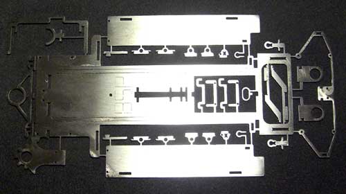 Next build up the rear end of the chassis. The motor locater, which also includes the up stops for the damper rail and the pans. I put oilites in the pillow blocks, before putting them in the slots. With the motor located held in place, slide the rear brace into position. This should interlock with the pillow blocks and the motor locater. Put an axle through the oilites,to ensure the pillow blocks are upright. Solder the parts together making sure the parts are flat , or at 90'.