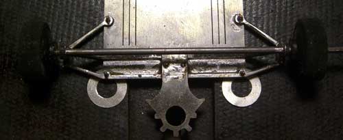 Now the axle. Pass the axle wire (.062) across the width of the chassis through the uprights. Using the wheels that will be used on the car you can set the height. On this chassis I have set ride height at .005 using some guide spacers under the main chassis.